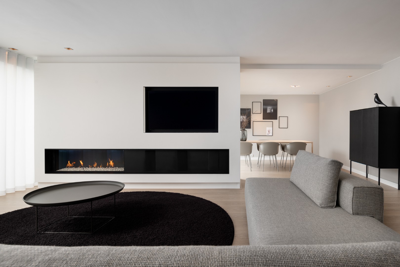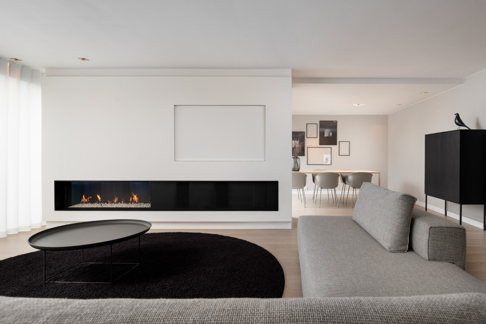 Dit project draait om rust en functionaliteit in een open leefruimte. De haardwand fungeert als roomdivider tussen wonen en eten en verbindt meerdere functies in één strak ontwerp. Vuur, beeld en geluid zijn zorgvuldig geïntegreerd, waardoor techniek aanwezig is zonder de serene uitstraling van het interieur te verstoren.