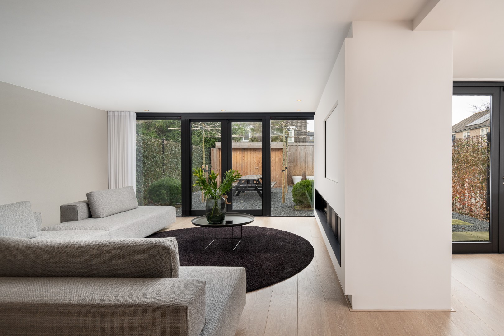 De wand combineert haard, televisie en audio in één samenhangend geheel. Door slimme integratie blijft het ontwerp rustig, terwijl alle dagelijkse functies logisch en comfortabel samenkomen.