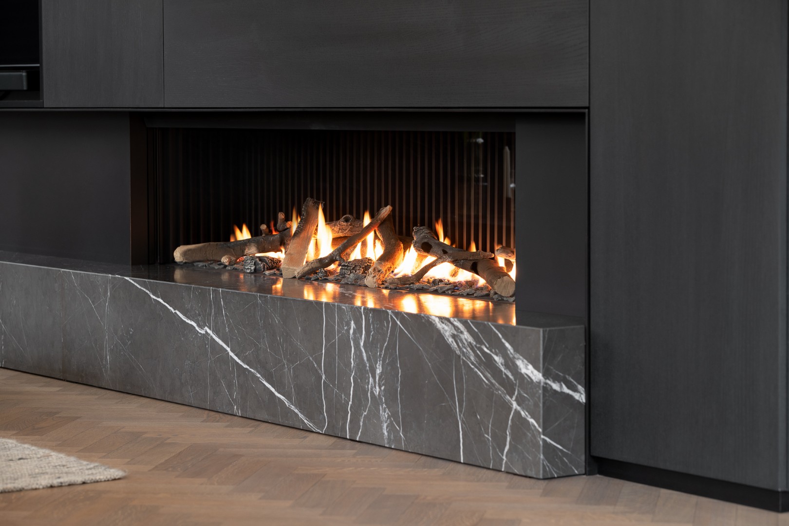 De haard rust op uniek Italiaans marmer, dat diepte en verfijning toevoegt. In combinatie met donkere kasten ontstaat een krachtig contrast tussen warmte en elegantie.
