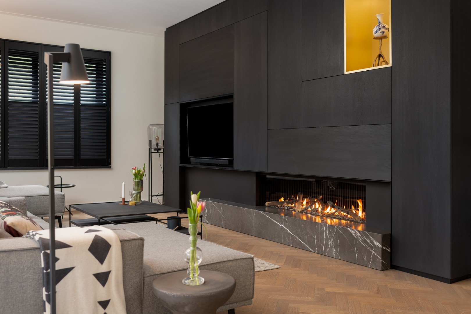 In dit project staat maatwerk centraal. De kastenwand is ontworpen als een krachtig architectonisch element waarin opbergen, vuur en techniek samenkomen. Donkere materialen en een robuuste marmeren basis zorgen voor een luxueuze uitstraling, terwijl de haard warmte en levendigheid toevoegt aan het geheel.